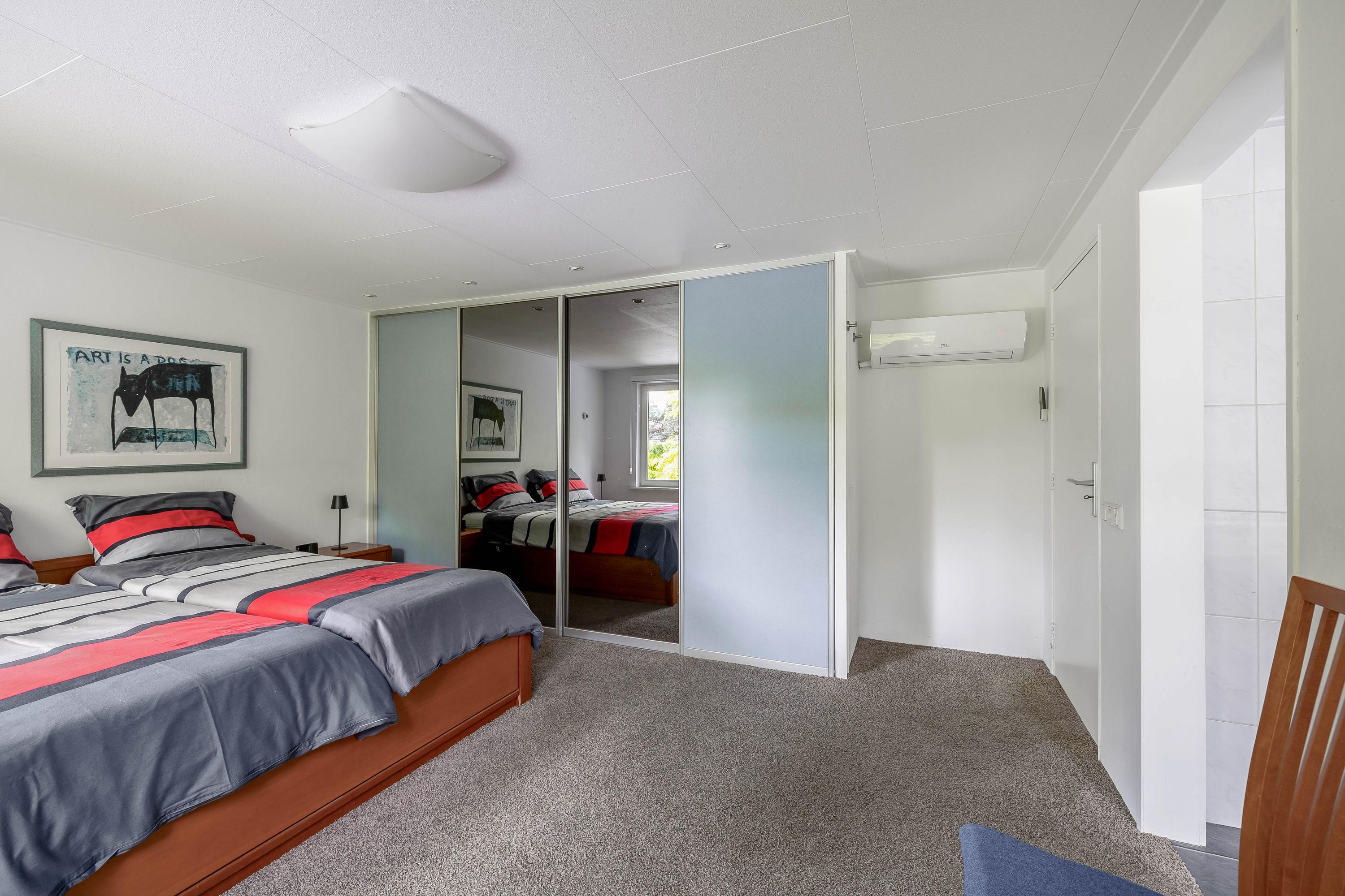 Slaapkamer 2 beschikt over een vaste inbouwkast met vier schuifdeuren en verlichting door inbouwspots. Ook hier draai-kiepramen met rolluiken en een hor. Stucwerkwanden, vloerbedekking en een airco, die voor verwarming en koeling zorgt