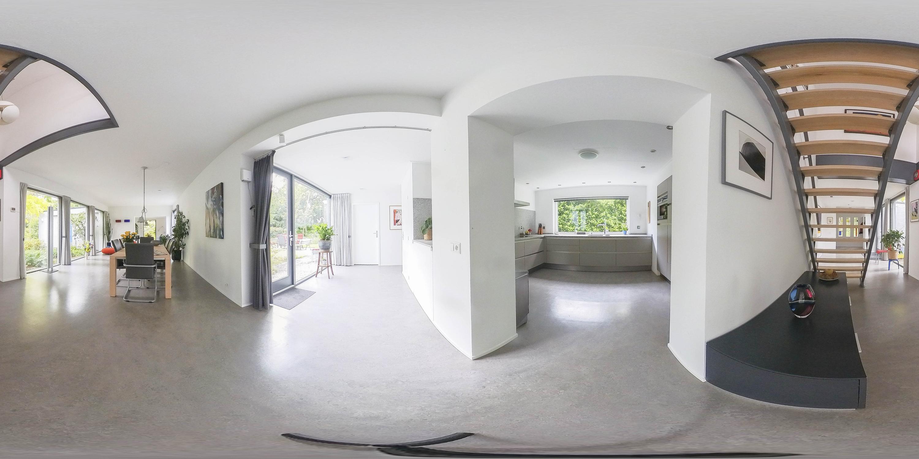 De open doorloop vanuit de entreehal leidt je naar de lichte en ruime woonkamer. Deze is afgewerkt met strak stucwerk op de wanden en de grote raampartijen tot vloerniveau bieden zicht op de patiotuin . Vloeren zijn uitgevoerd met vloerverwarming alsmede de mogelijkheid tot verkoeling, wat zorgt voor een aangenaam klimaat in elk seizoen. Een blikvanger in de woonkamer is de open trapopgang van esdoornhout en staal naar de verdieping.