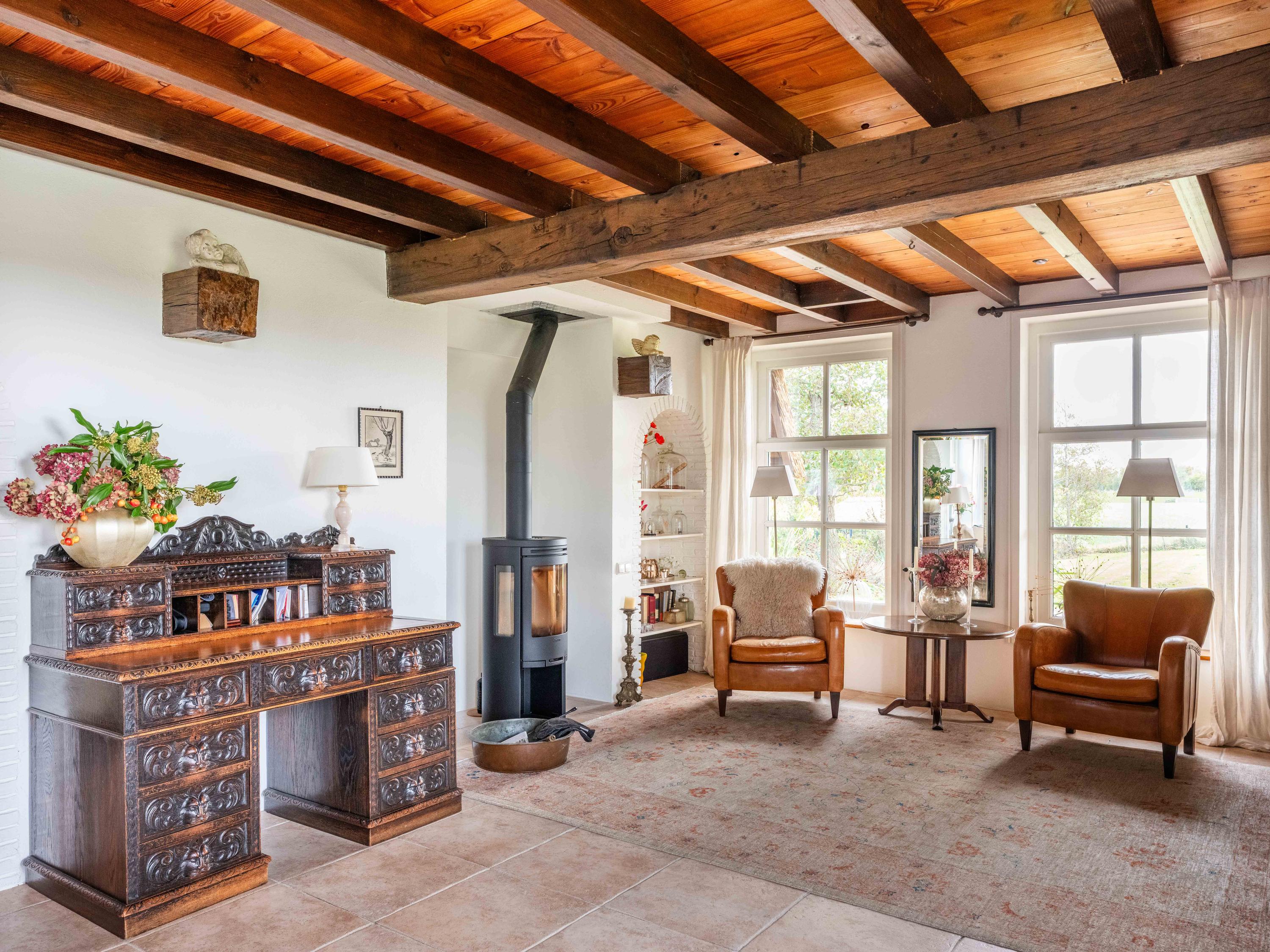 Via de hal met garderoberuimte en bergkast bereik je het toilet met fonteintje en de trap naar de eerste verdieping. Vanuit de hal stap je direct door naar de gezellige eetruimte met open keuken. De grote ramen bieden een prachtig zicht op de groene tuin rondom. De landelijke keuken is voorzien van vaste kasten en volop bergruimte. Vanuit hier is er tevens toegang tot de ruime kelder, ideaal voor voorraad of als wijnkelder. De royale woonkeuken vormt het hart van het huis, met authentieke details zoals een Engelse fornuis met vier ovens en karakteristieke balkenplafonds.