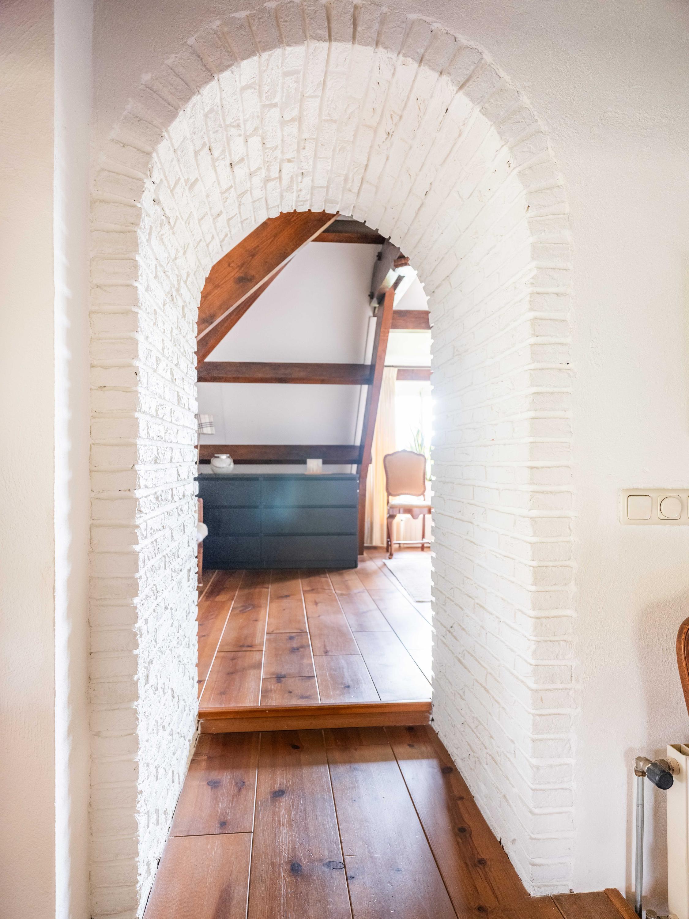 De trap leidt naar een ruime open vide met zicht op de keuken beneden. Deze ruimte doet momenteel dienst als werk- en logeerruimte en heeft uitzicht op de tuin rondom. Via de open doorgang bereik je de royale slaapkamer met een adembenemend uitzicht over de tuin, het water en de uitgestrekte weilanden.