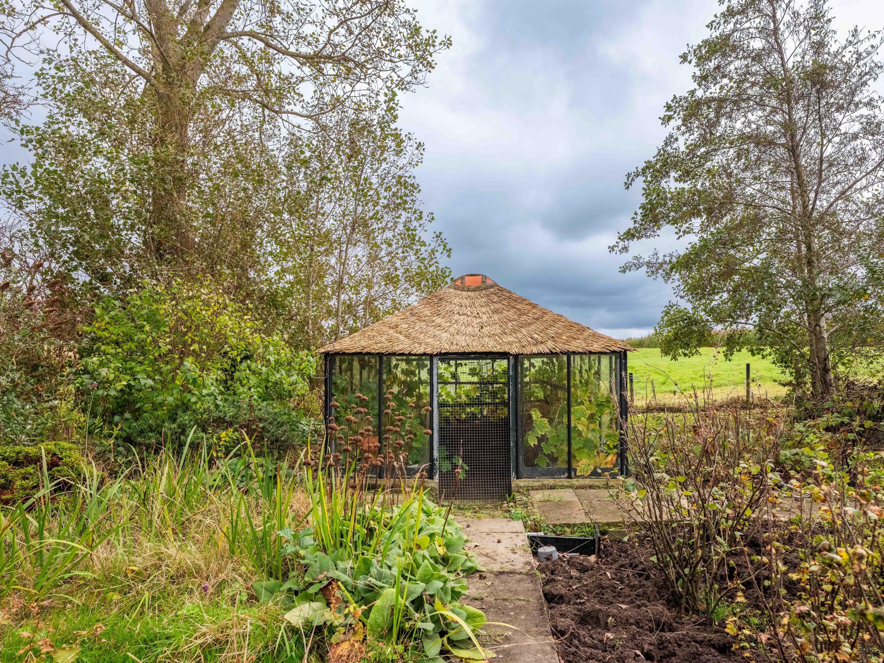 In de fraai aangelegde tuin bevindt zich een volledig ingericht gastenverblijf met een eigen houtkachel, open keuken met complete apparatuur, wasmachine en droger, eetruimte en radiatoren. Let op het sfeervolle lage plafond. De slaapkamer beschikt over een eigen douche, terwijl er ook een separaat toilet met wastafel aanwezig is. Boven biedt een zolder extra bergruimte.