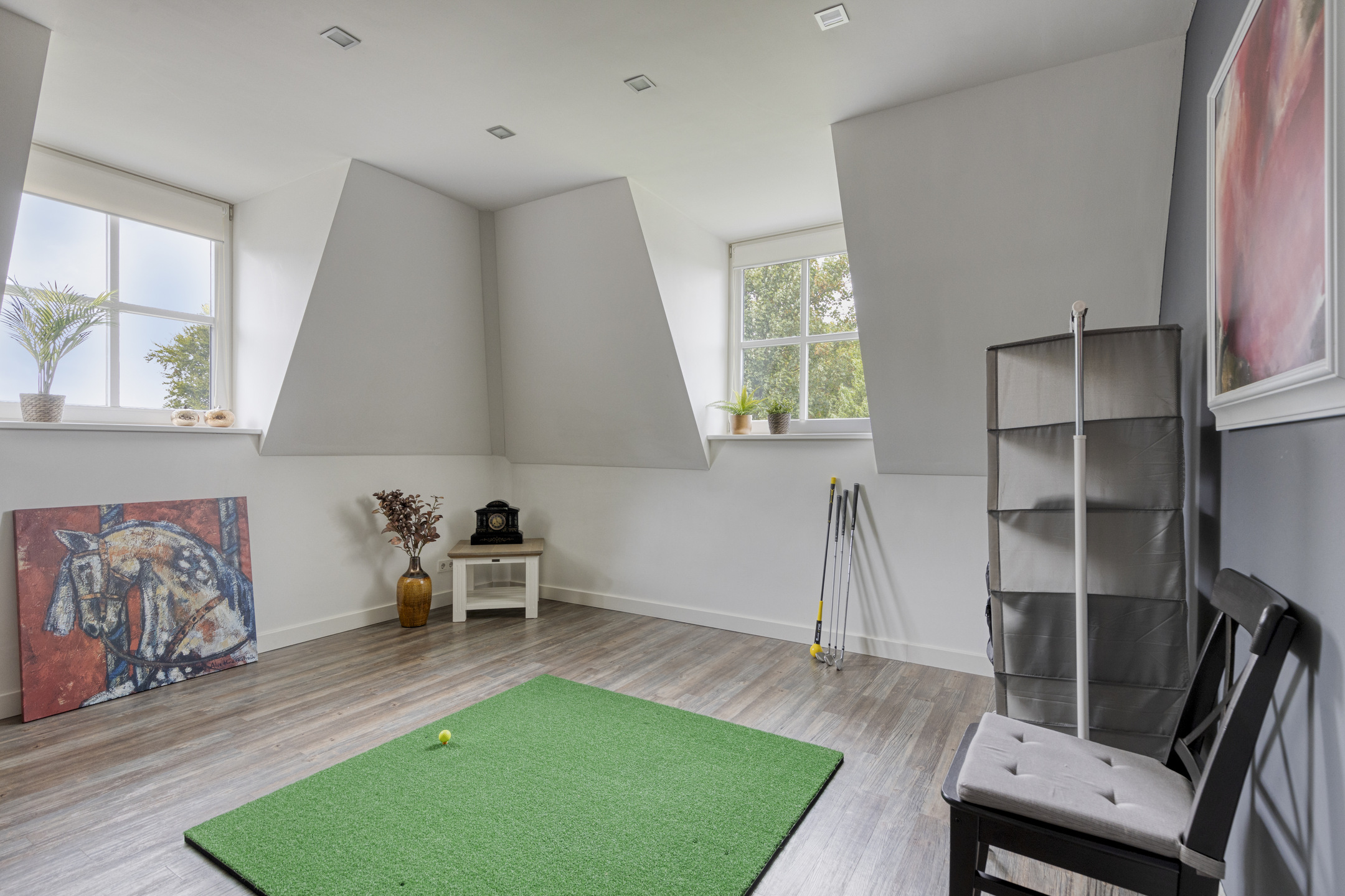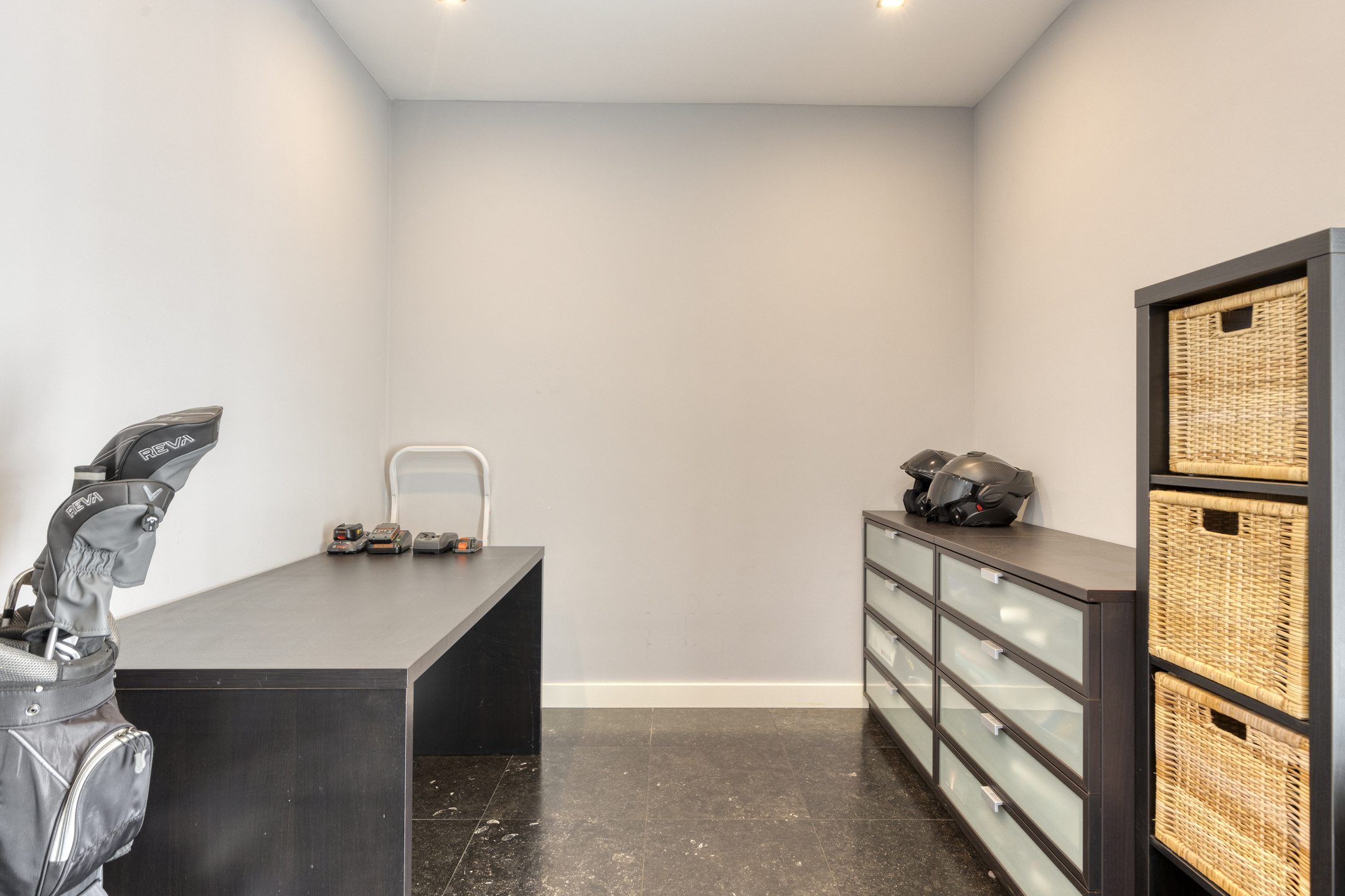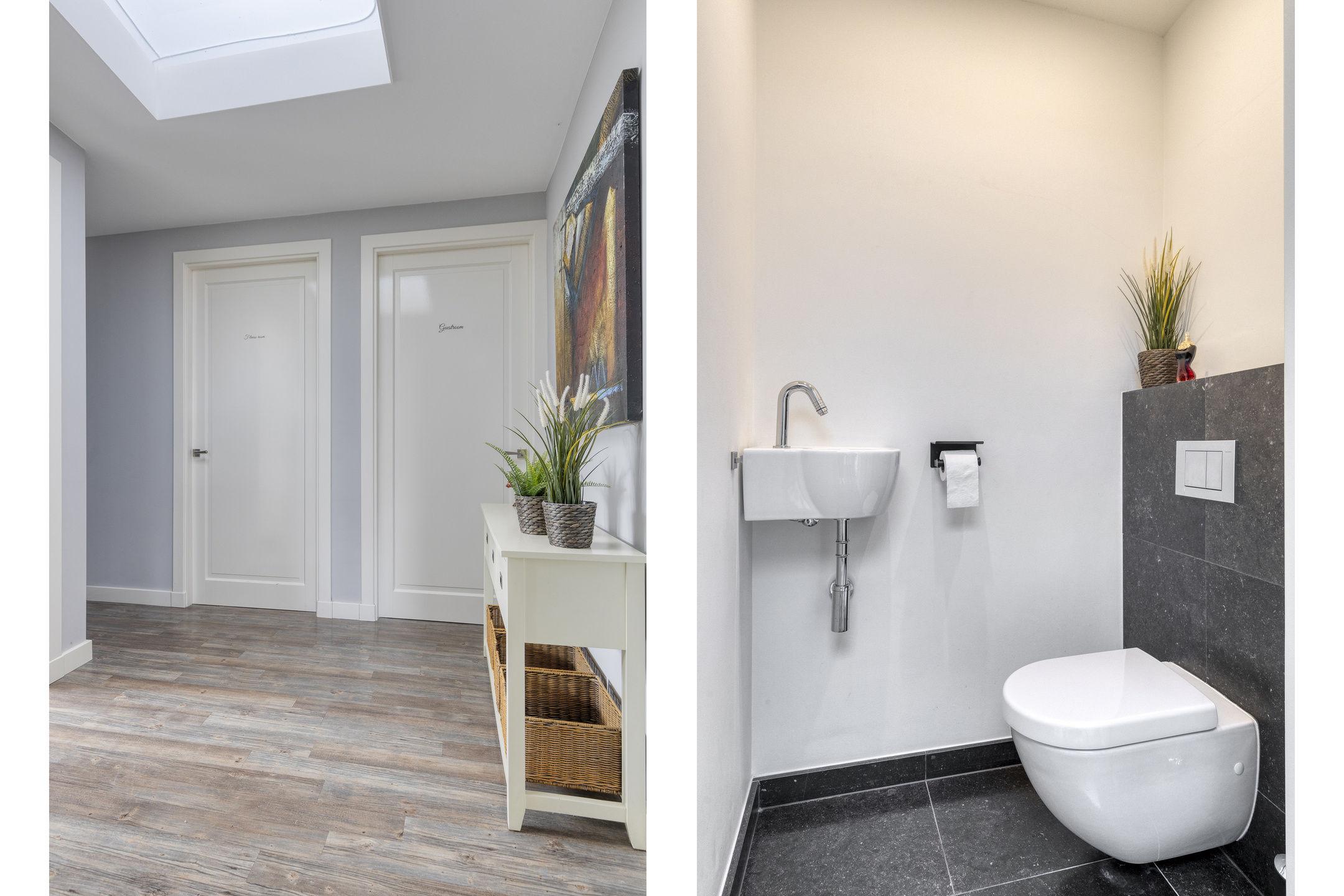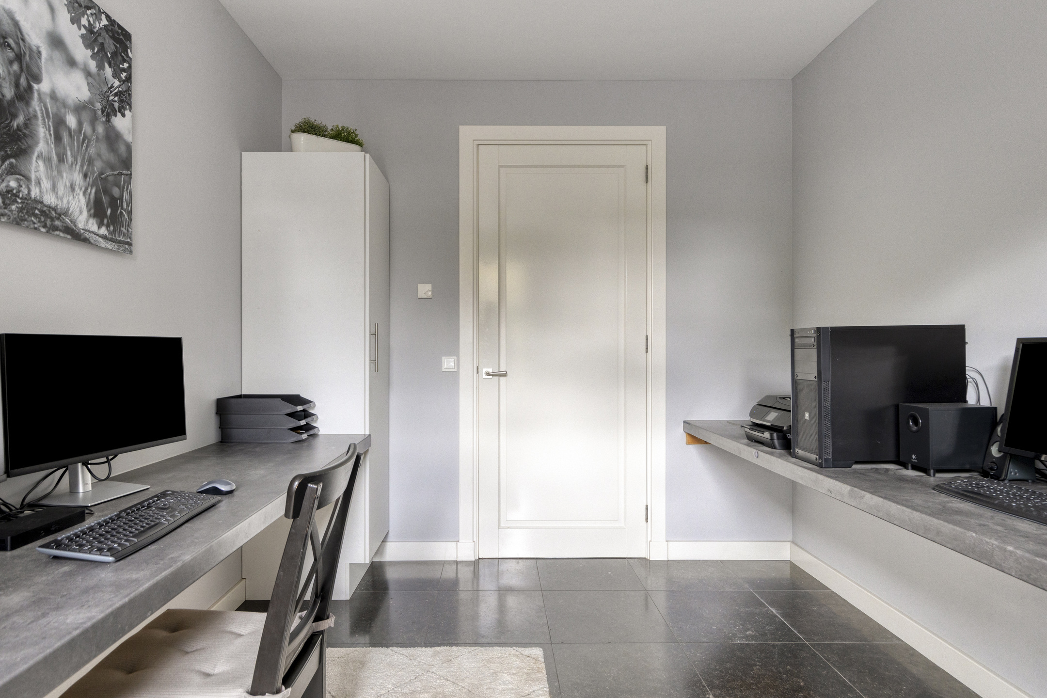 Daarnaast beschikt de begane grond over een werk- of studeerkamer, een praktische bijkeuken en een ruime multifunctionele vleugel. Deze vleugel kan dienen als kantoor, salon of praktijkruimte, of – in combinatie met de garage met volwaardige verdieping – als comfortabele aanleunwoning. Een eigen toilet en keukenblok zijn hier reeds aanwezig.