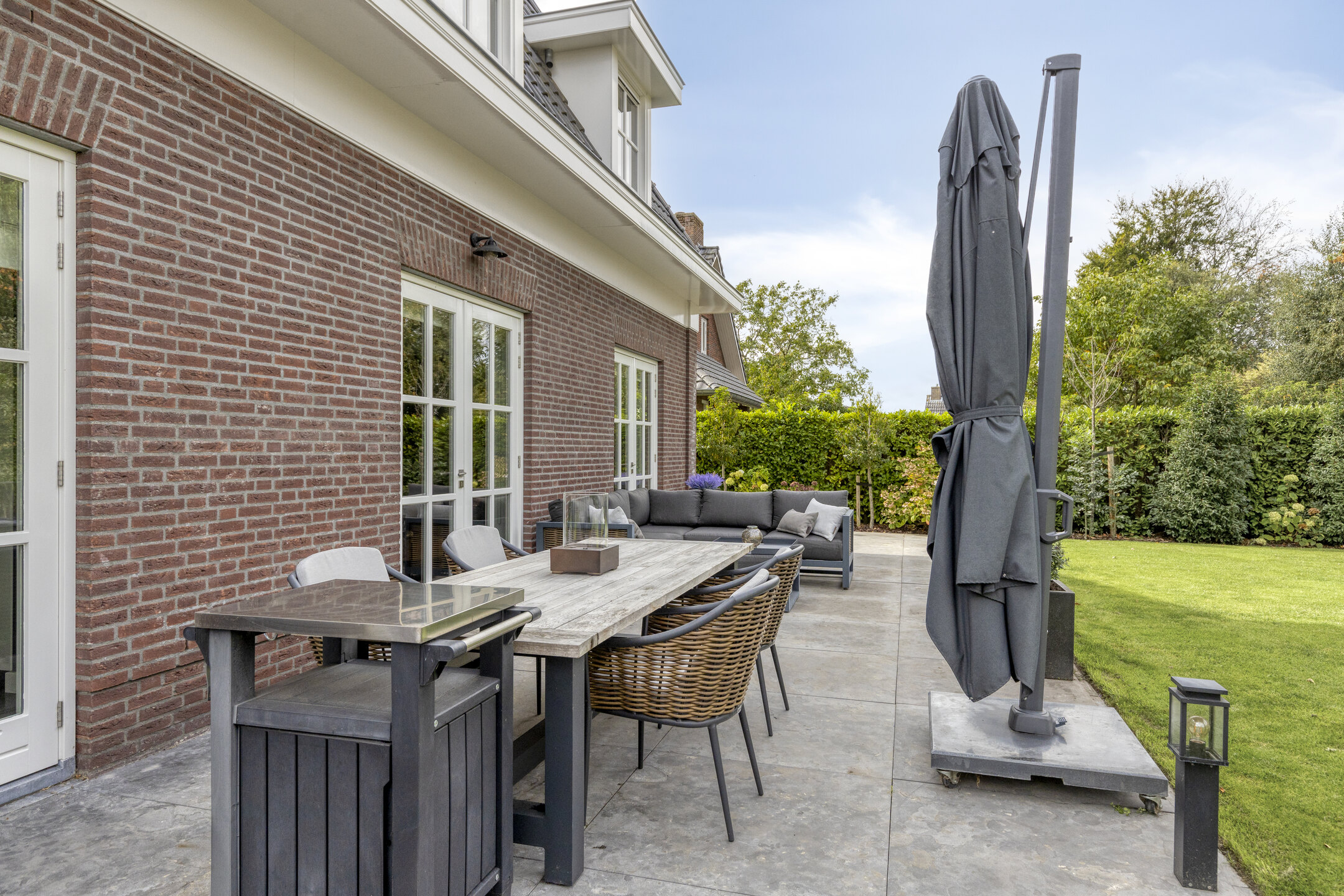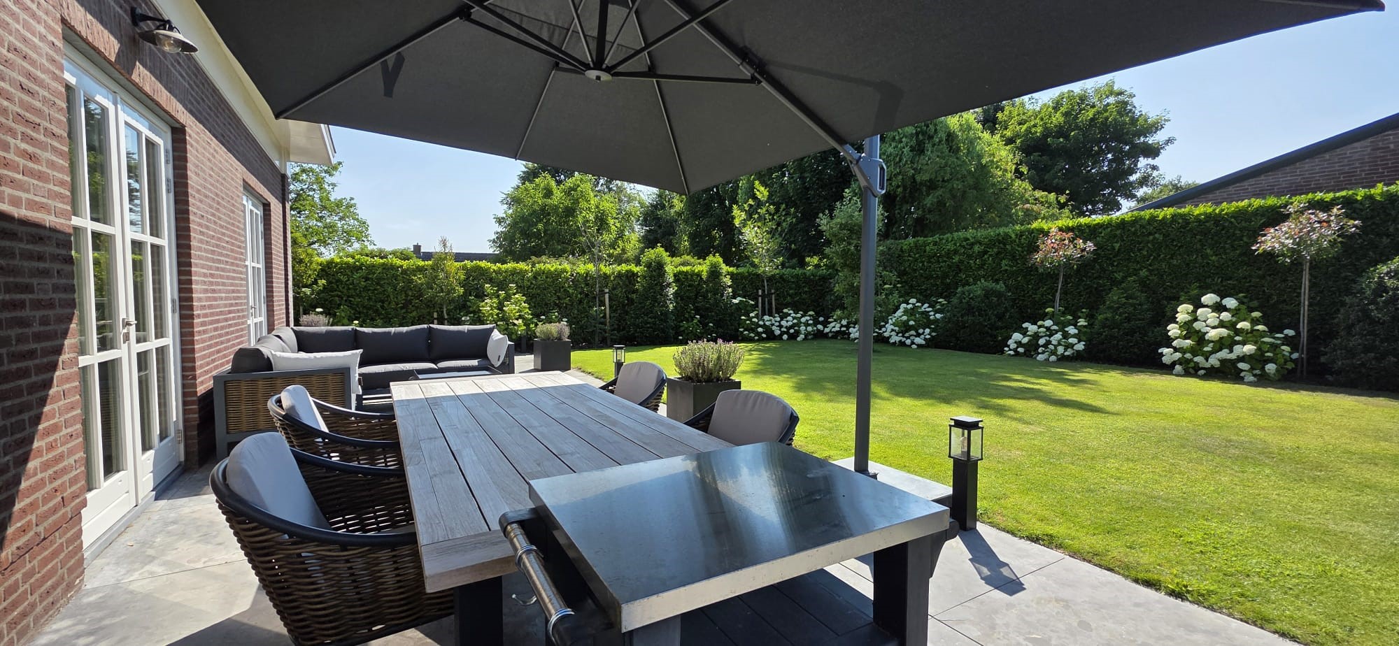 Het buitenleven is goed verzorgd. De tuin is fraai aangelegd en uitstekend onderhouden, met natuurstenen terrassen, veel groen en een automatische beregeningsinstallatie. De zonnige ligging, de dubbele garage met gepolijste en gecoate betonvloer en de royale oprit – bereikbaar via een tweedelige elektrische toegangspoort die klasse en kwaliteit uitstraalt. Prachtig uitzicht op landerijen en de molen van Wouw.