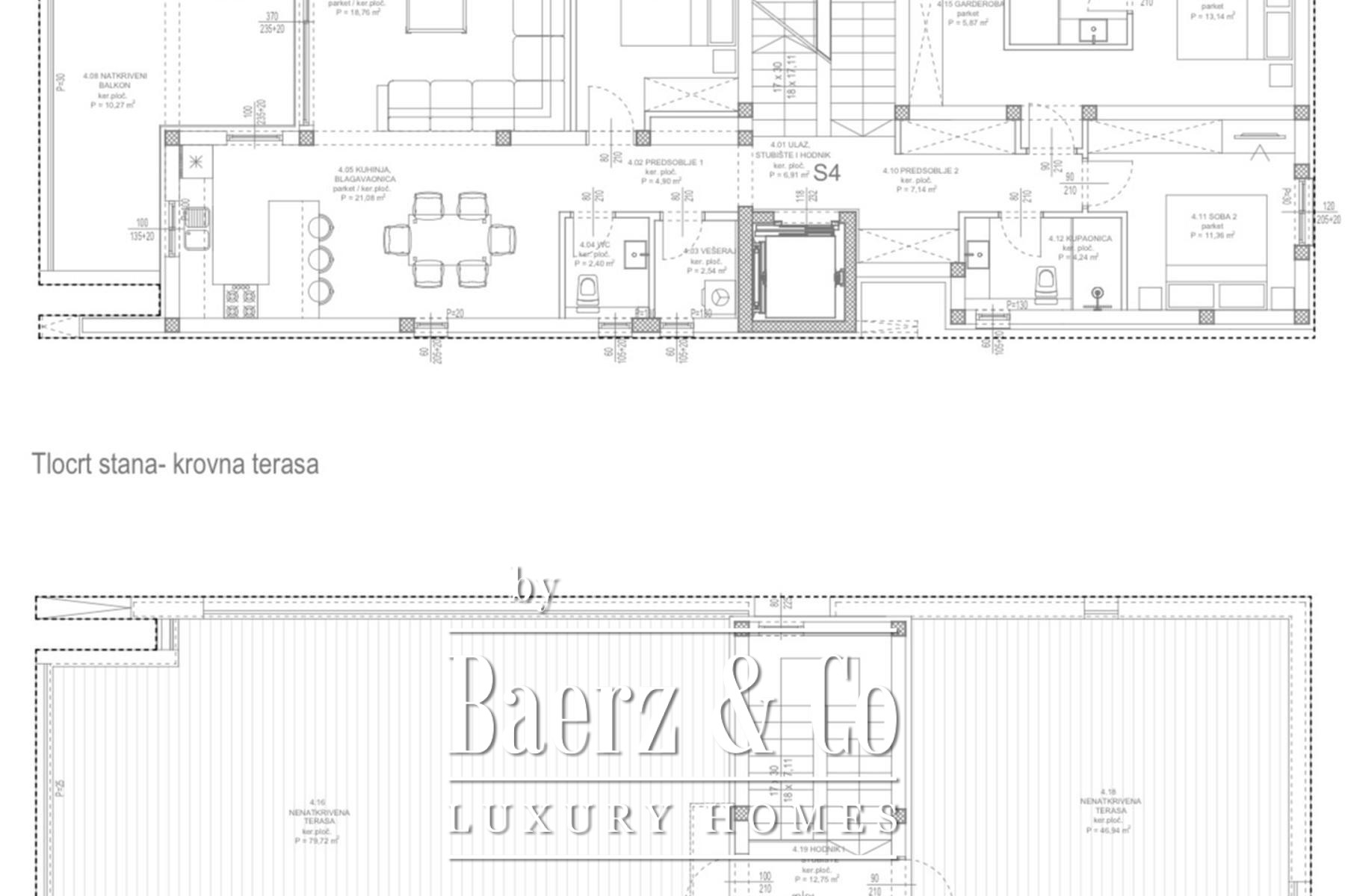 Het hoogtepunt is het 126 m² grote dakterras met panoramisch uitzicht over de kustlijn, speciaal ontworpen voor ontspanning en entertainment het hele jaar door. Materialen en afwerkingen zijn zorgvuldig gekozen: aluminium kozijnen met driedubbel IZO-glas, Italiaans keramiek en hoogwaardig sanitair van LAUFEN, HANSGROHE en GEBERIT. Comfort wordt gegarandeerd dankzij Mitsubishi airconditioning, elektrische vloerverwarming en een A+ energielabel. Een Schindler-lift biedt directe toegang tot het penthouse; de beveiliging en akoestische kwaliteit van de entree zorgen voor extra klasse. Penthouse Zadar - Okolica is een zeldzame kans voor wie stijl, privacy en nabijheid van Zadar waardeert in een discrete Adriatische setting.